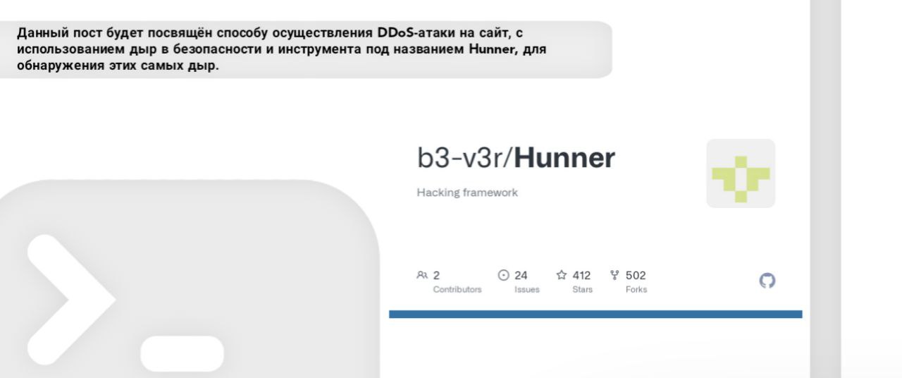 Данный пост будет посвящён способу осуществления DDoS-атаки на сайт, с использованием дыр в безопасности и инструмента под названием Hunner, для обнаружения этих самых дыр.