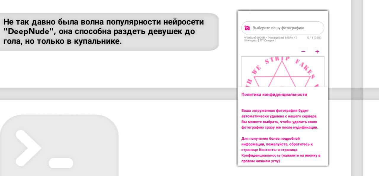 Не так давно была волна популярности нейросети "DeepNude", она способна раздеть девушек до гола, но только в купальнике. Но недавно вышла новая - DeepSukeb, она работает более лучше, ибо раздеть можно даже девушку в куртке, но есть минус - дают только 3 бесплатные попытки.