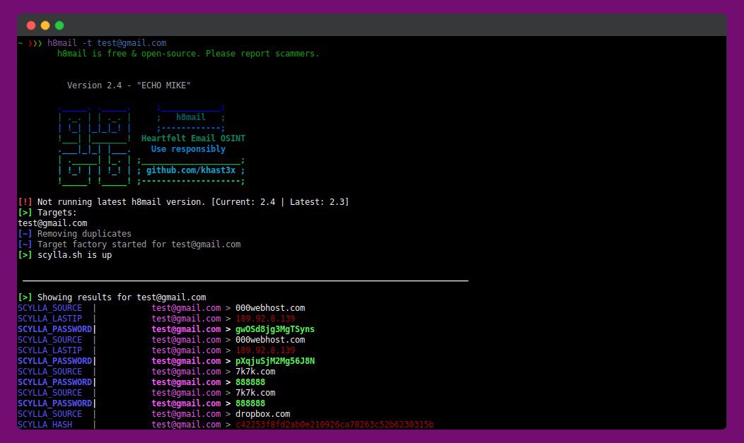 Но все же есть еще пару интересных утилит. Одна из таких - h8mail. Чем же она хороша? Она прогонят нужную вам почту по своим базам и выдает некоторое кол-во паролей, С ее помощью можно получить доступ не только к почтовому ящику, а вообще ко всем аккаунтам, если пользователь использует одни и те же пароли.