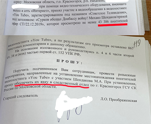 Согласно документам, которые оказались в распоряжении журналистов, старший следователь Преображенская Л. О. направила просьбу начальнику УМВД по Красногорску «обеспечить явку» в следственный отдел зрителей ролика Шендакова. В запросе указано, что ролик посмотрело более 43 тысяч посетителей YouTube.
