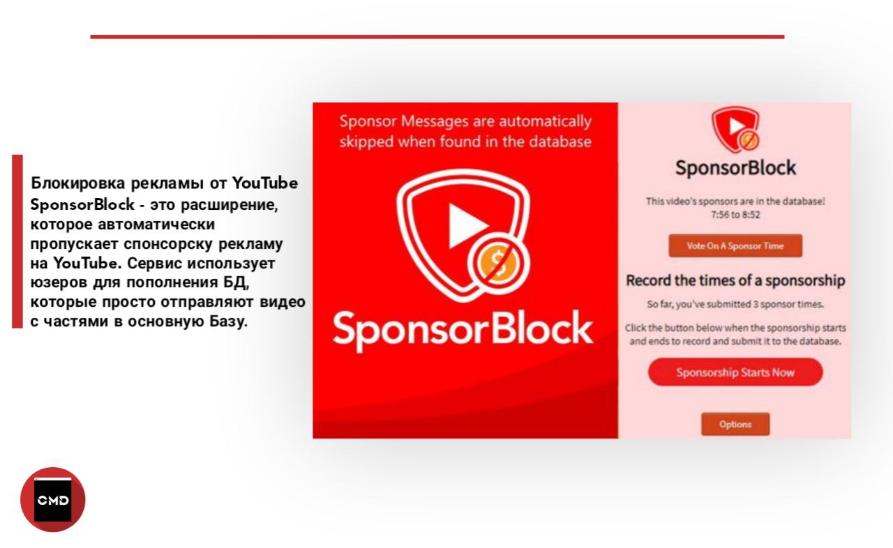 SponsorBlock - это расширение, которое автоматически пропускает спонсорску рекламу на YouTube. Сервис использует юзеров для пополнения БД, которые просто отправляют видео с частями в основную Базу.