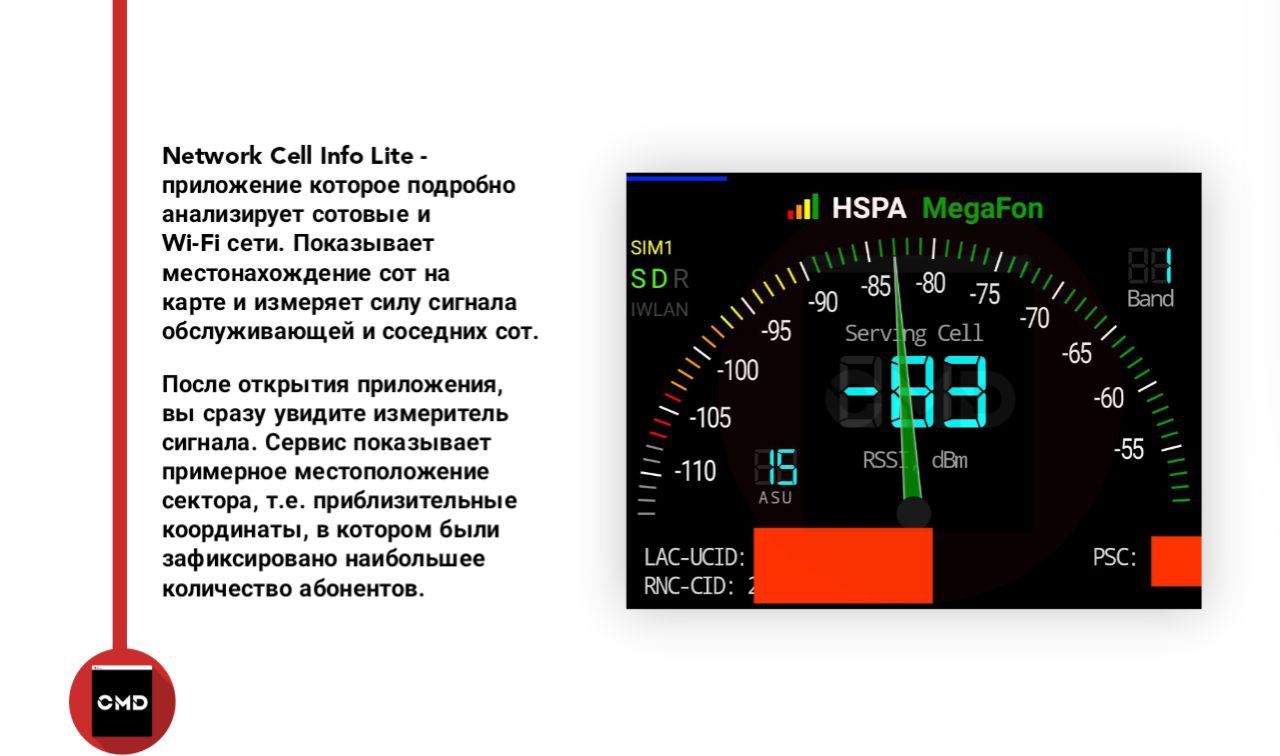 Network Cell Info Lite - приложение которое подробно анализирует сотовые и Wi-Fi сети. Показывает местонахождение сот на карте и измеряет силу сигнала обслуживающей и соседних сот.