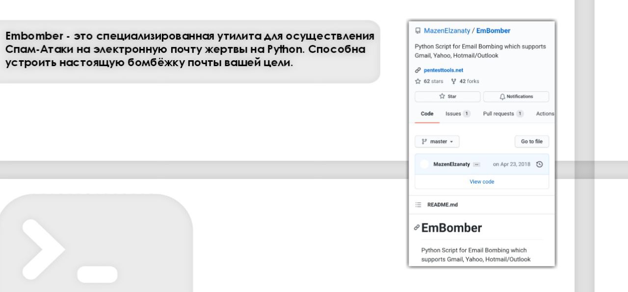 Embomber - это специализированная утилита для осуществления Спам-Атаки на электронную почту жертвы на Python. Способна устроить настоящую бомбёжку почты вашей цели. Поддерживает Gmail, Yahoo, Hotmail, Outlook и так далее. Утилита работает на всех дистрибутивах Linux, на которых установлен Python 2.7.