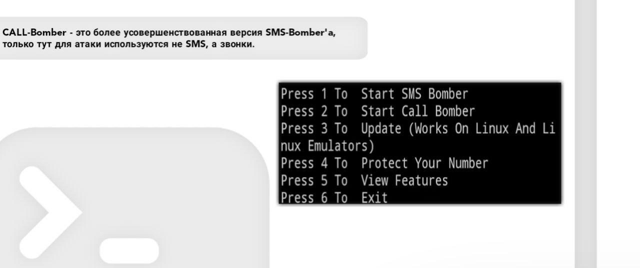CALL Bomber - это более усовершенствованная версия SMS Bomber'a, только тут для атаки используются не SMS, а звонки. Максимально эффективная и быстрая атака, которая точно не оставит жертву в покое, пока она не будет отключена.
