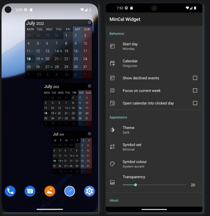 🔸Personalizable: día de inicio de la semana, calendario (gregoriano o holoceno), mostrar eventos rechazados, centrarse en la semana actual, abrir el calendario en el día seleccionado, tema, juego de caracteres, color del juego de caracteres, transparencia