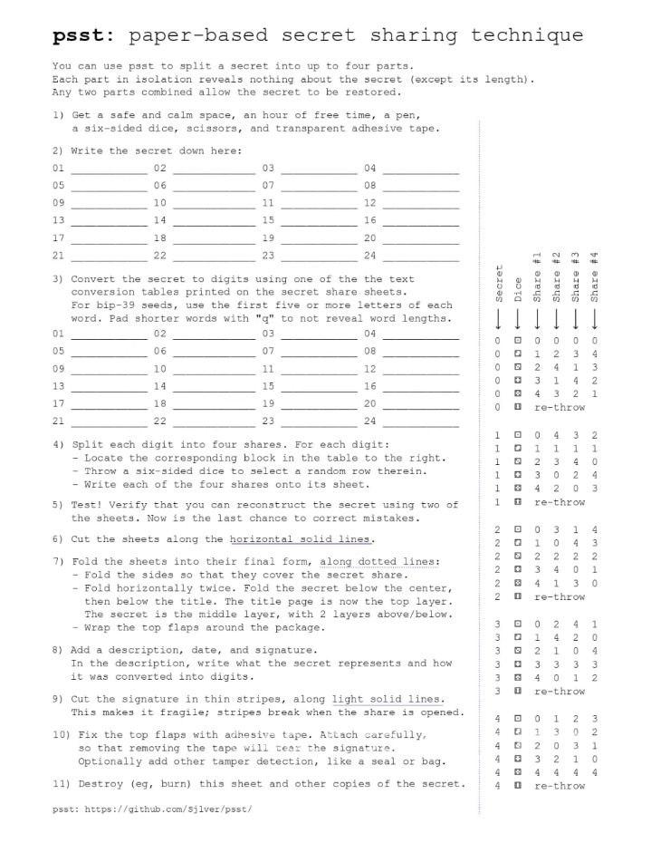 psst ayuda al usuario a dividir un secreto en cuatro partes. Cada parte por separado no revela nada sobre el secreto (excepto su longitud). Dos partes cualesquiera combinadas permiten recuperar el secreto.