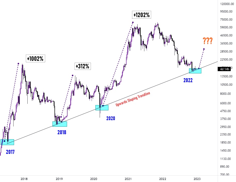 Касание этого динамического уровня в 2017-м году приводило к ралли на +1002%, в 2018-м — к движению в +312%, в 2020-м — на +1202%