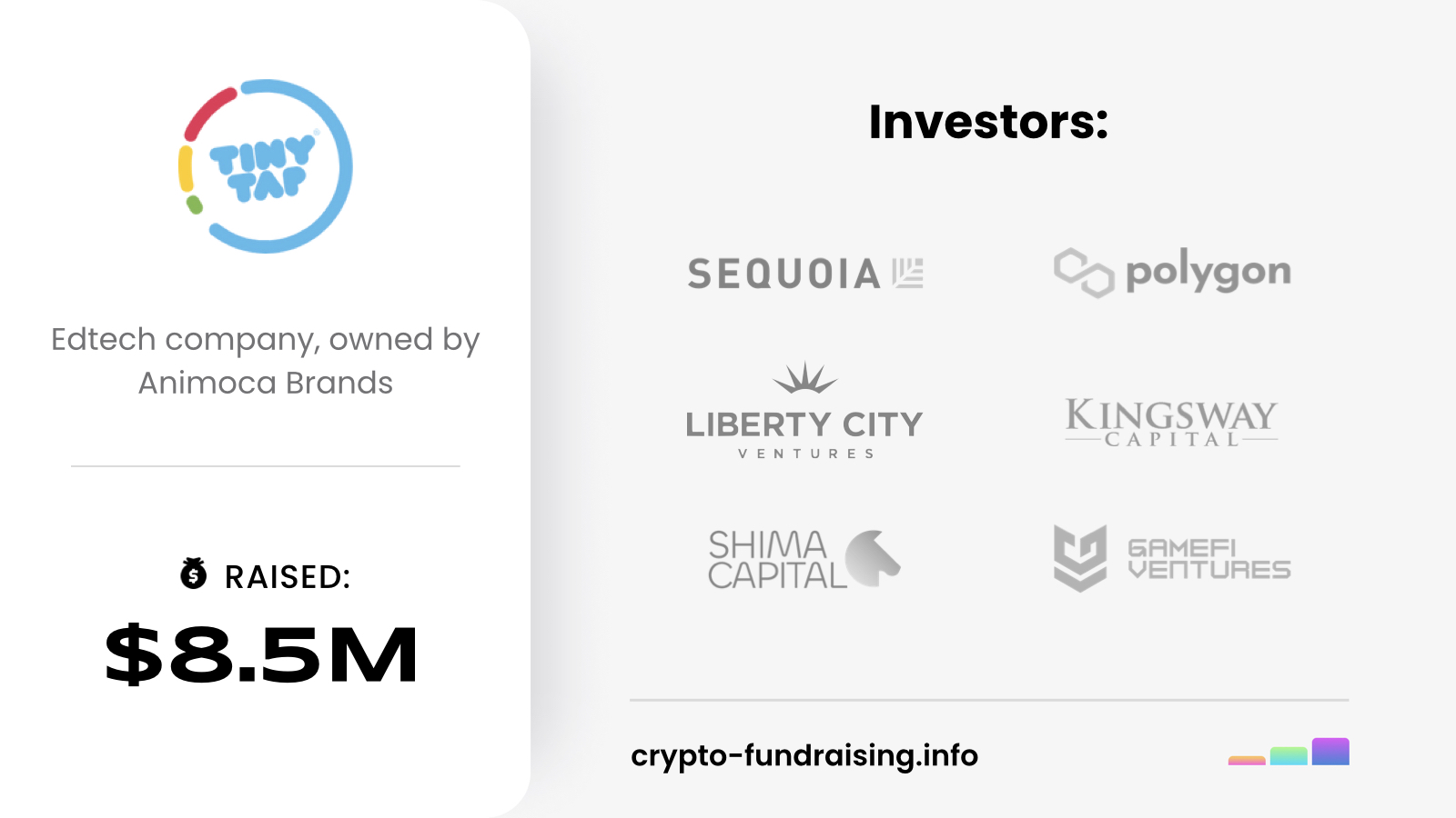 Edtech company, owned by Animoca Brands, TinyTap raised $8.5M in a funding round from Sequoia Capital, Polygon Ventures, Liberty City Ventures, Kingsway Capital, Shima Capital, GameFi Ventures