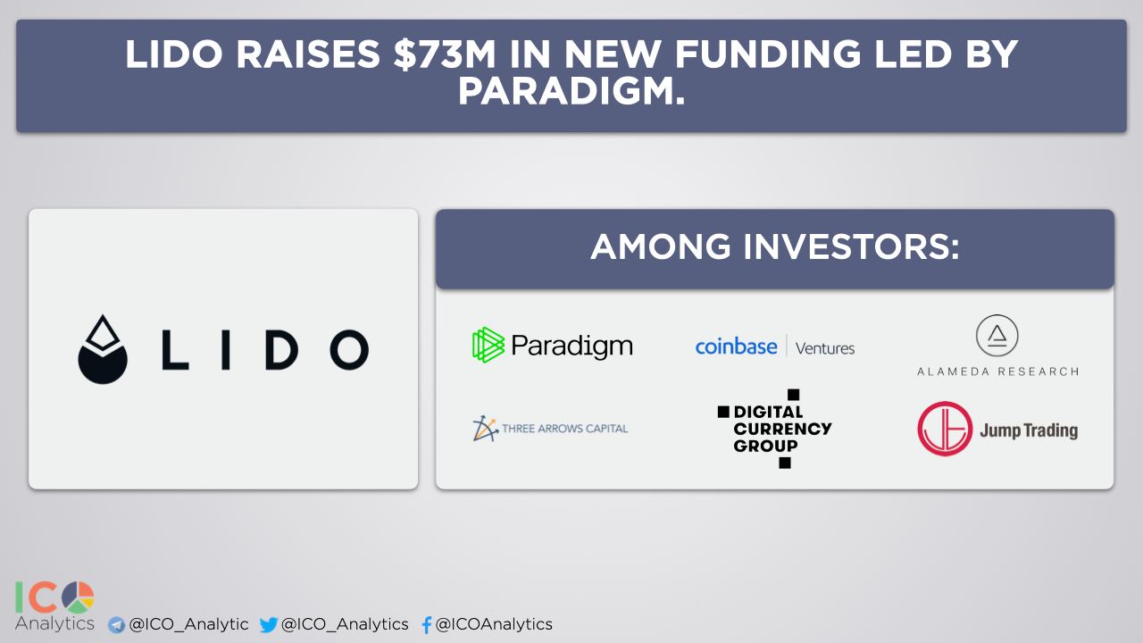 Lido raises $73M in new funding led by Paradigm. Coinbase Ventures, Three Arrows Capital, Jump Trading, Alameda Research, Digital Currency Group are also among investors. Lido is a staking protocol that allows users to unlock staked ETH and use it in other DeFi applications.