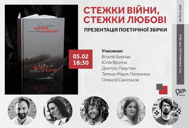 У середу 5 лютого в просторі наших партнерів PEN Ukraine відбудеться презентація збірки "Стежки війни, стежки любові", де будуть присутні автори: Віталій Бирчак, Юлія Вротна, Дмитро Лазуткін, Тетяна-Марія Литвинюк та Олексій Самсонов.