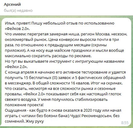 Подключили нашу систему "Фейки 2.0" к текущему аккаунту. И за 2 почти "мертвые" недели майских праздников получили 16 квалифицированных лидов.