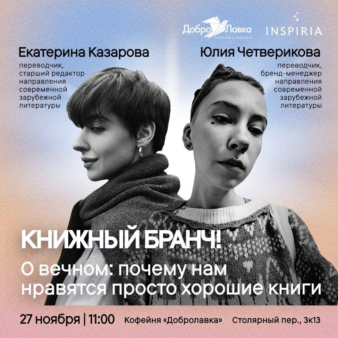 Выпьем кофе, поедим вкусного и просто, по-дружески поговорим о «вечных» книжках. О тех, которые не в повесточке и не на острие, но которые можно открыть в любое время и просто получить удовольствие. Расскажем вам о своих «вечных» и с большим удовольствием послушаем о ваших. Ну и коль скоро мы обе переводчицы и обе работаем в издательстве, то еще сможем ответить на ваши вопросы о том как мы делаем книги, если вам захочется спросить)