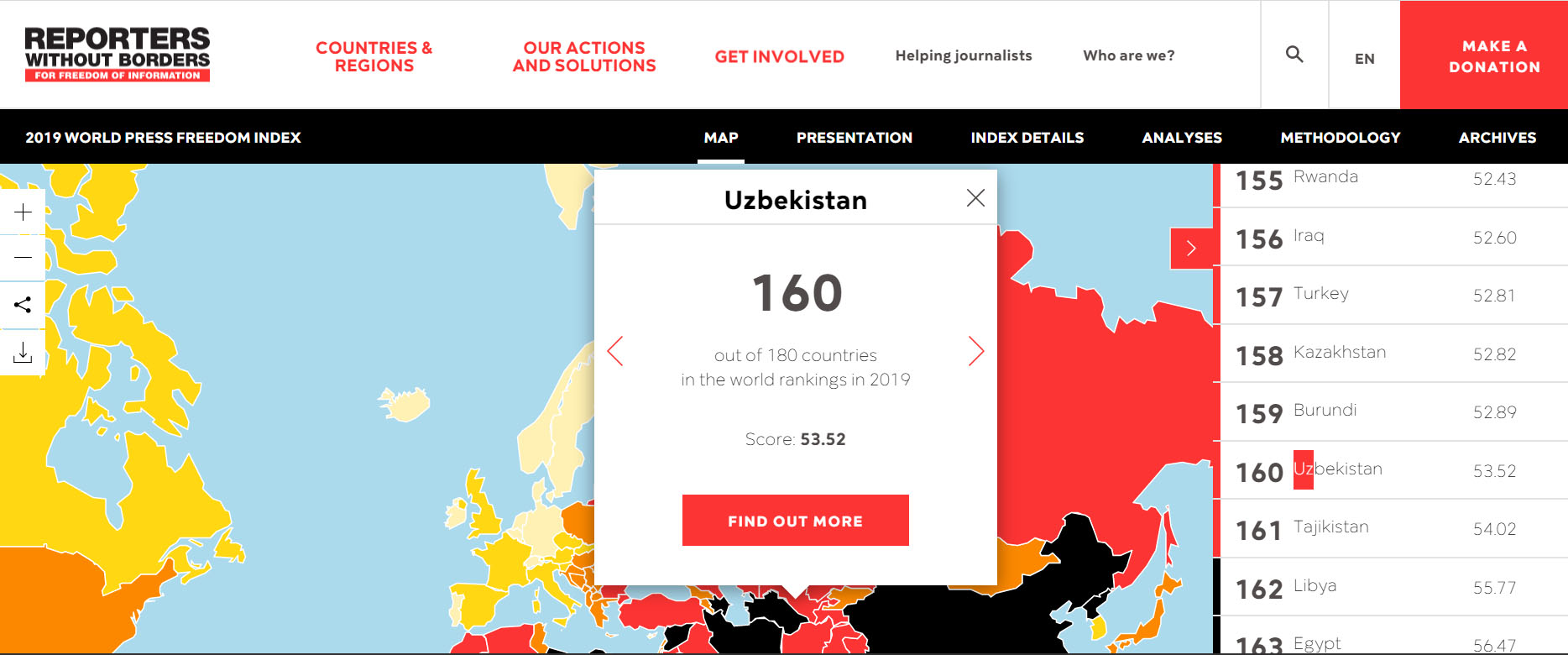 Узбекистан занимает 160-е место из 180 стран в рейтинге свободы слова-2019 от "Репортеров без границ".