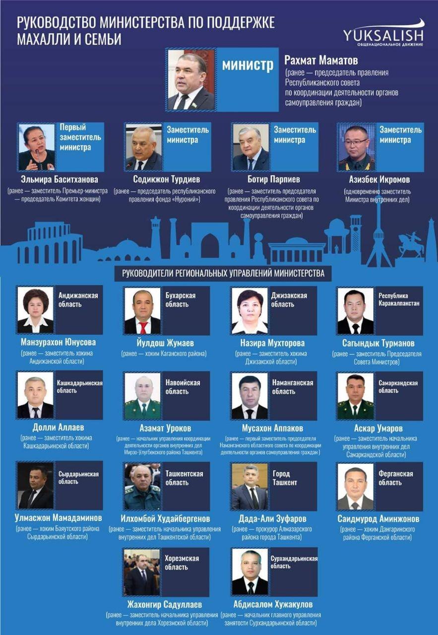 Объявили руководителей свежеиспечённого Министерства по делам махалли и семьи и его региональных управлений. Около половины руководителей - выходцы из силовых ведомств. Есть над чем задуматься.