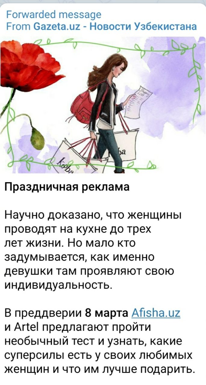 Дорогие Артель и Афиша! Куда же без махрового сексизма в преддверии 8 марта, да? И как же выбрать подарок любимой, если не при помощи дешёвого теста? Вы же с ней каждый день не общаетесь, не разговариваете и вкусов ейных и желаний не знаете?