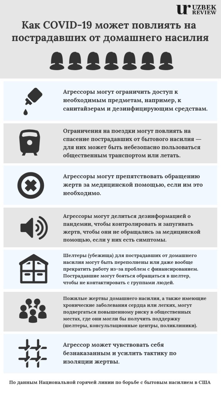 Национальная горячая линия по борьбе с бытовым насилием в США на выходных опубликовала заявление. Эксперты описали, как пандемия COVID-19 может повлиять на пострадавших от насилия со стороны близкого партнера-агрессора (см.иллюстрацию).