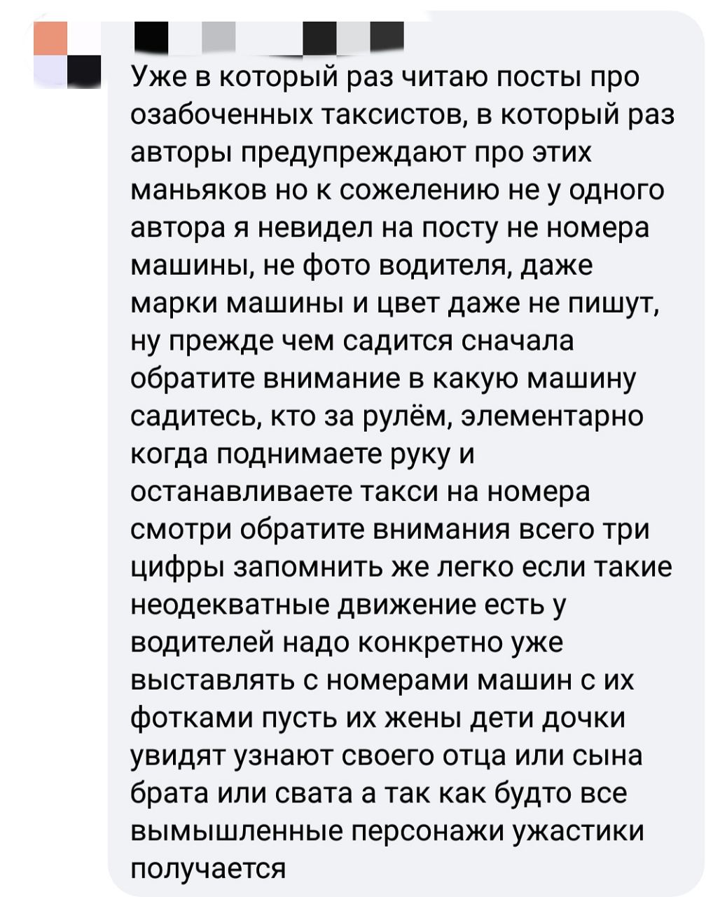 Комментарий от мужчины на скриншоте. Инструкция о том, как бояться каждого таксиста и принимать меры предосторожности. А когда женщина подозревает в каждом мужчине маньяка эти же люди первыми кричат: "Не все такие!!! Если вас кто-то обидел, это ваши проблемы. Вы злобные фемки!"