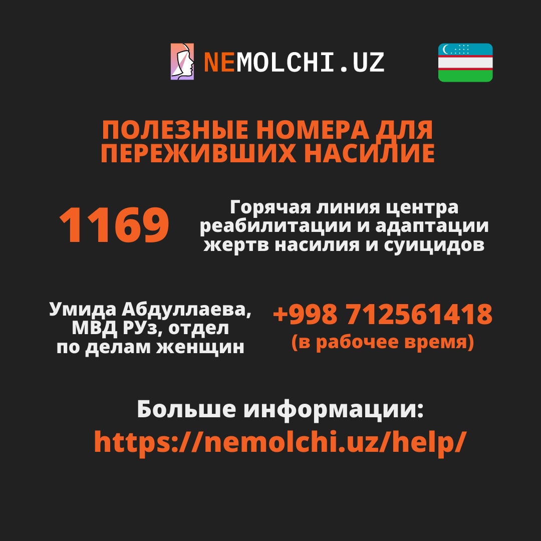 Советую позвонить в 1169 ― это центр реабилитации и адаптации жертв насилия. Там её должны принять, дать временное убежище, помочь с психологом. Пишу в МВД, Умиде Абдуллаевой (руководительница отдела по делам женщин), описываю ситуацию, даю номер девушки. Умида Хазратовна перезванивает ей сама, потом передаёт информацию инспекторам по делам женщин.