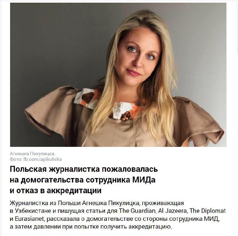 Мы сидели в кафе "Бон" на Чимкентской, в сотне метров от бывшего здания МИДа. Много говорили о правах женщин в Узбекистане, о законодательстве, о системе образования. Тогда она упомянула про поведение сотрудника МИД. Я рада, что Агнешка написала об этом. Не рада, что ей отказали в аккредитации👎👎👎