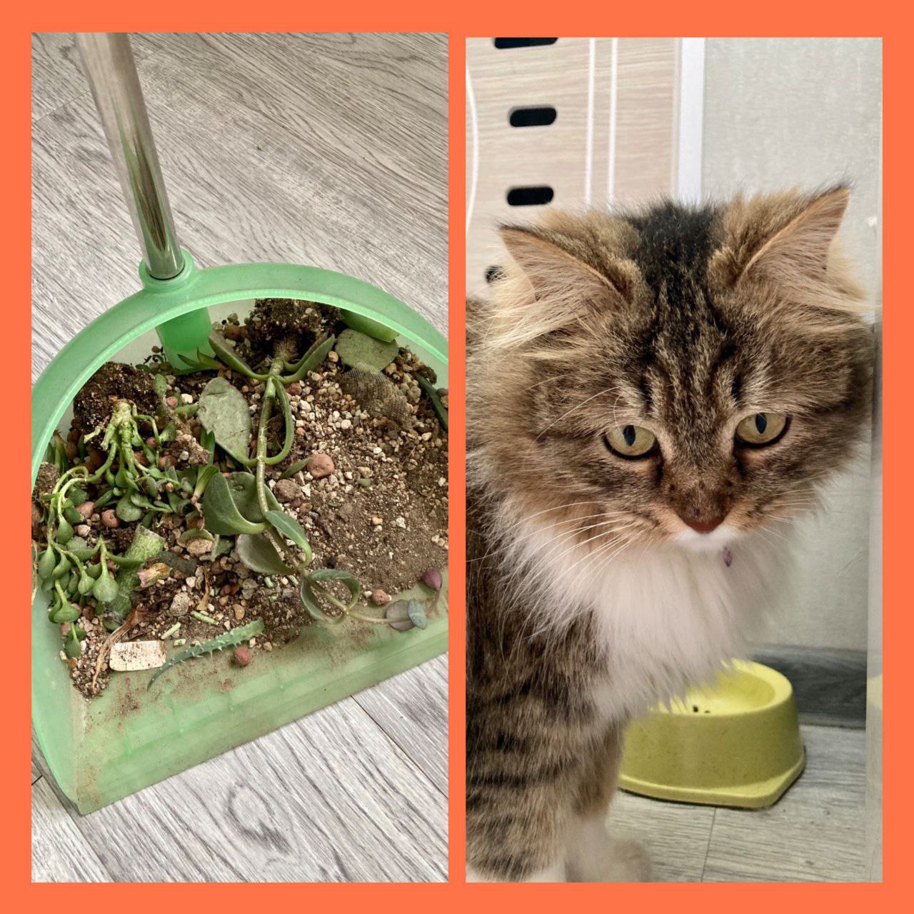 Вчера продемонстрировала часть офисной растительности. Сегодня пришла на работу — а там сюрприз: поддон с мелкими суккулентами лежит на полу. Но, конечно, это сделала не Бастет, вы только посмотрите в её честные глаза 😊)