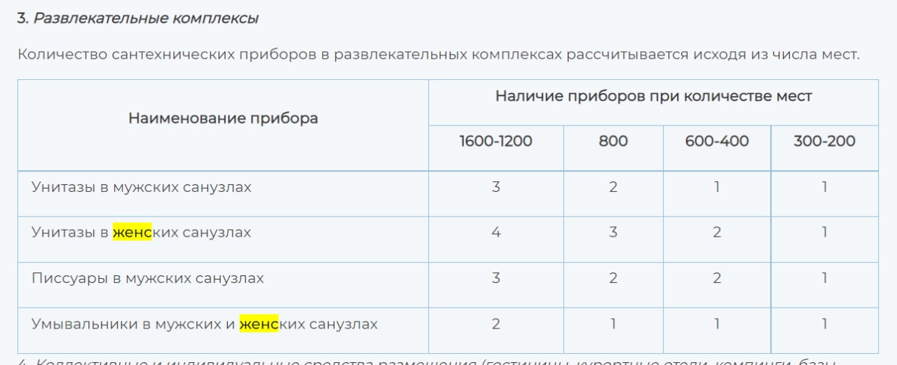 И отдельно про развлекательные комплексы. Не могу точно утверждать, но предполагаю, что количество женщин в развлекательных комплексах больше, чем количество мужчин, потому что туда часто ходят с детьми, и пока муж работает, жена-домохозяйка может пойти туда с ребёнок. Рекомендации по количеству туалетов в развлекательных комплексах на картинке. Да, число унитазов в женских туалетах больше, чем в мужских. Но к мужским «очкам» нужно добавить ещё и писсуары. Получается, что у мужчин по нашим СанПИН больше точек, чтобы справить нужду.