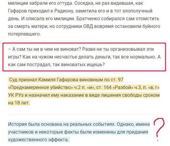 - У тебя мать убили из-за денег? Так из-за тебя же парень в долги влез. Ты на нём зарабатывал - вот и получил ответку.