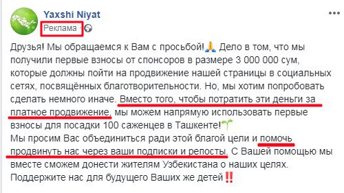 Отчего бы не продвинуть команду, которая получила деньги на платное продвижение, но решила их не тратить на это? А попросила подписчиков сделать больше репостов. И дала об этом рекламу на Фейсбук.