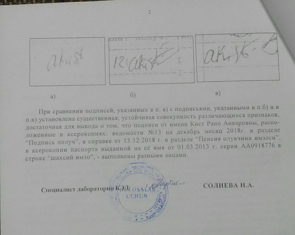 Рано это возмутило и она поехала в М.Улугбекский банк. Встретилась с Ш.Бафаевым, где он показал ей эту ведомость. Она сфотографировала ведомость и написала в Прокуратуру и в Портал, изложив ситуацию. Ей посоветовали сделать почерковую экспертизу, которая стоит немалых денег. Экспертиза стоит 922 тыс. сумов. Но Рано говорит, что ради справедливости, тем более аферисты покусились на святое – похоронные деньги. Она заплатила и ей сделали экспертизу. Выкладываю фотографии и вывод экспертов.