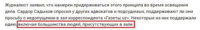 Всё плохо? Нет, не всё 😊 Например, бабушка выиграла два суда (районный и городской суд), также по её делу был вынесен протест прокурора. Cколько человек обратят внимание на эти детали? Большинство будут обсуждать, что власть (волшебным образом сюда попадут все, начиная от ТЧСЖ, махаллинских комитетов и заканчивая судьями и прокуратурой) ни во что не ставит людей. И не заметят труд чиновников, которые руководствовались законом. Не обратят внимание на то, что суды и прокуратура вынесли решение в пользу бабушки, не имеющей денег или связей. Ведь закон на стороне бабушки. И поэтому чиновник, игнорирующий решения суда и протест прокурора, совершает преступление против народа. Обесценивает работу каждого служащего в каждой ветви власти. Подрывает доверие к органам власти в целом.
