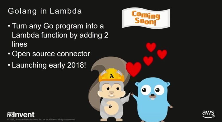 AWS Lambda is adding support for Go: https://youtu.be/WrPOz2dx8XY?t=55m48s #golang #aws https://pbs.twimg.com/media/DR3BBf2XUAAzIWe.jpg