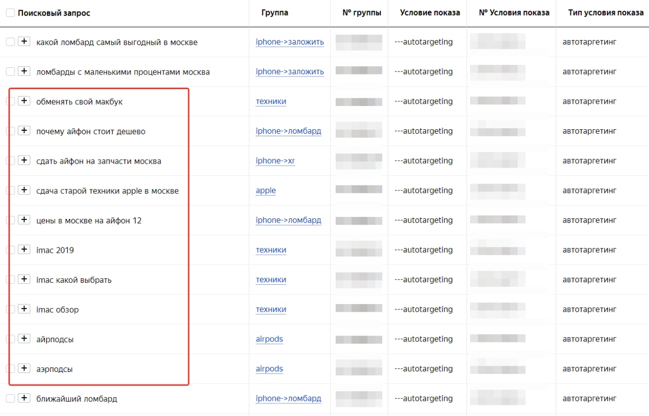 Ответственно заявляю - это работает херово (если быть точной, то не работает вообще). Тематика объявления и лендинга — сдача техники Apple в ломбард под залог. Я бы поняла, если бы автотаргет показывал объявление по запросам в духе "продать айфон/макбук/эирподсы" — это хотя бы как-то соотносилось с желанием человека получить деньги за свою технику как можно быстрее. Но широкий запрос "аэрподсы" или "ломбард"? Яндекс, я для тебя какая-то шутка?