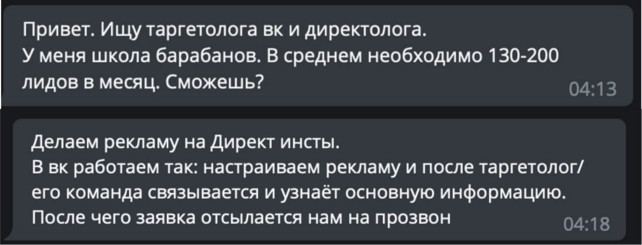После нескольких уточняющих вопросов выяснилось, что в понимании этого человека директолог = человек, который льет трафик на Директ инстаграма, первично обрабатывает лидов, а горячих передаёт клиенту. Судя по всему, ему нужно было 150-200 именно "горячих" лидов. Бюджеты при этом неизвестны, как и размер оплаты — даже уточнять не стала. Минимум двум моим коллегам прилетал такой же запрос от этого же человека. Такое на моей практике впервые :)
