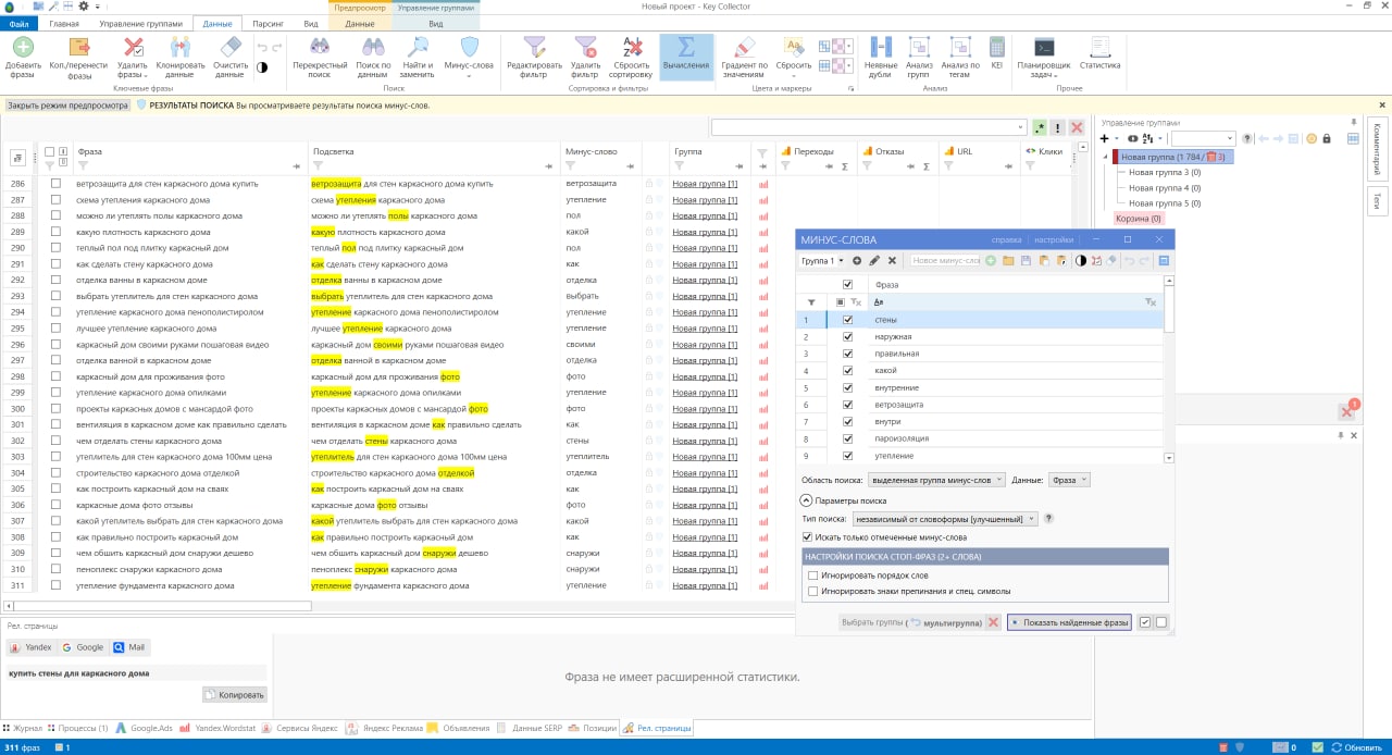 Собрала руки в ноги и заставила себя начать работу над новым проектом в Key Collector 4. Как же я кайфую! Работа с минус-словами вышла на новый уровень 🙈 Теперь стыдно, что не начала это делать раньше.