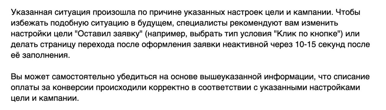 Пишу в поддержку: "Так и так, списание за три несуществующие заявки, верните бабки". Яндекс взял 1 день на подумать и затем выдал: "У вас по умолчанию стоит модель атрибуции "Последний переход из Яндекс.Директ", поэтому это переходы на сохранённую страницу ранних пользователей. Чтобы такого не было, поменяйте цель на "клик по кнопке" или делайте страницу неактивной в через 10-15 сек после её заполнения".