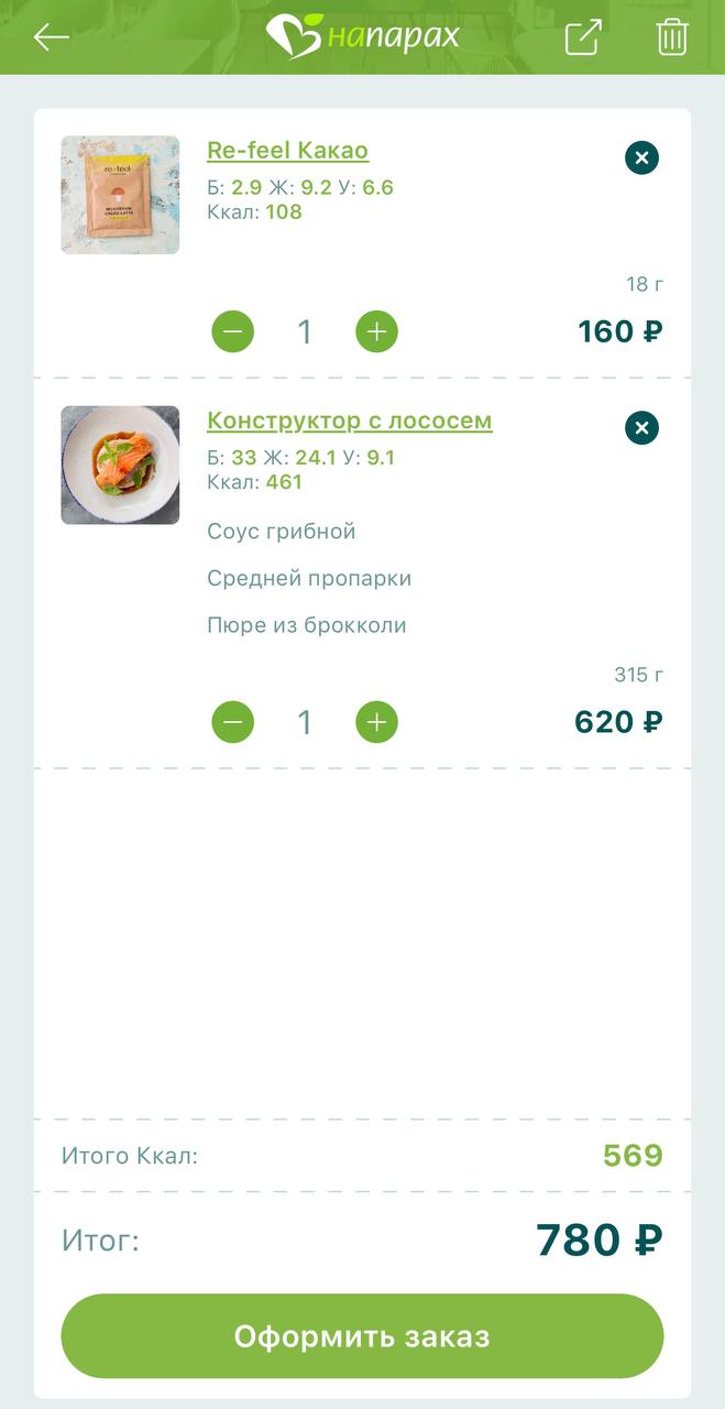 НаПарах - аплодирую стоя. Великолепный пример заботы о клиенте (и его здоровье) — в корзине указывается общее количество калорий в заказе. Лично мне не хватает отображения общего БЖУ, так как при моей диете важно поддерживать 70-80% жиров в рационе, но думаю это ещё реализуют.