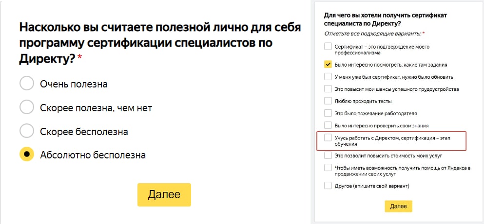 Кажется, в Яндексе начали догонять, что сертификация — бесполезное г... (ой, простите) мероприятие, цель которого создать видимость большого количества "сертифицированных" специалистов, которые по факту получают сертификаты, заучивая ответы, или ещё лучше — получают их, как "этап обучения" (о чём и говорит один из пунктов в опросе).