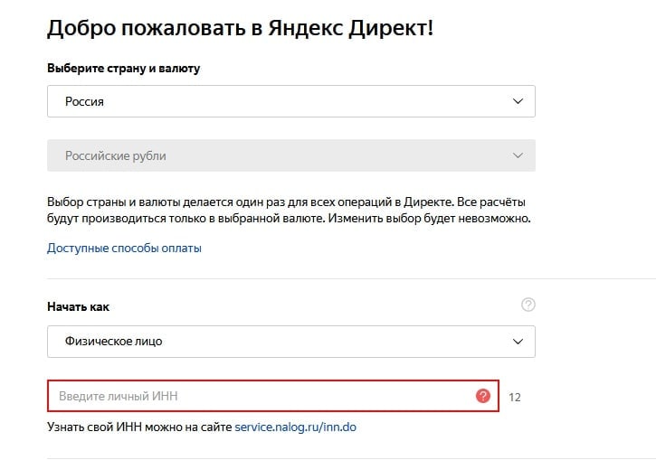 Яндекс.Директ начал спрашивать ИНН при регистрации аккаунта