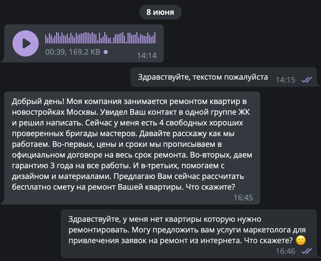 Увидела в РСЯ объявление директолога, перешла на сайт. Ниже иллюстрация к блоку "Возможно вам знакома ситуация, когда специалист долго не выходит на связь". Вам не кажется, что с этой "перепиской" что-то не так?