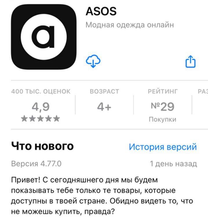 Некогда горячо любимый мной ASOS решил пошутить в AppStore над своими клиентами: «Привет! С сегодняшнего дня мы будем показывать тебе только те товары, которые доступны в твоей стране. Обидно видеть то, что не можешь купить, правда?»