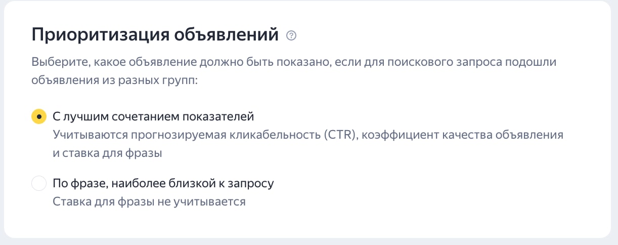 По факту, это старый добрый "Выбор объявления для показа: по показателям или точности соответствия", но другими словами. И есть кое-что в формулировке, что меня смущает: