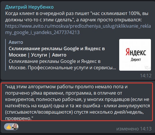 UPD: Лол, мне тут за рекламу предъявляют. Для тех, кто в танке: это объявление о склике на Авито, где человек утверждает, что большая часть программ по склику нерабочая и Яндекс возвращает деньги за так называемый "склик". Кто говорил о рекламе, вы с какой планеты?
