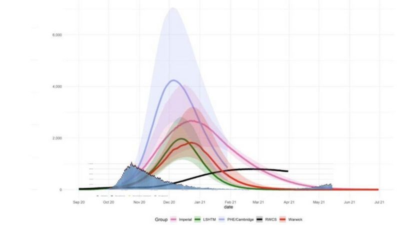 BBC публикует сводную модель с прогнозами от разных групп экспертов из презентации государственной группы по моделированию пандемии SPI-M-O. Ковид распространяется по Англии значительно быстрее, чем предполагал самый пессимистичный сценарий правительства.