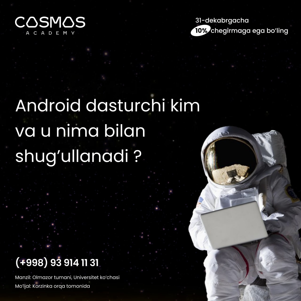 🚀 Siz ham Android dasturchi boʻlishni xohlaysizmi ? Sizda bizning Android Development kurslarimizda o'qish va malakali mentorlardan ta'lim olish imkoniyati mavjud. Buning uchun hoziroq ro'yxatdan o'ting va kelajak kasbini professional tarzda o'rganing !!!