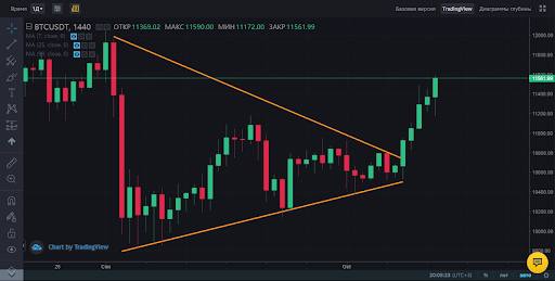 Треугольник используется, чтобы найти точку пробоя на графике. Пробой уровня поддержки или сопротивления может указывать на новый тренд.