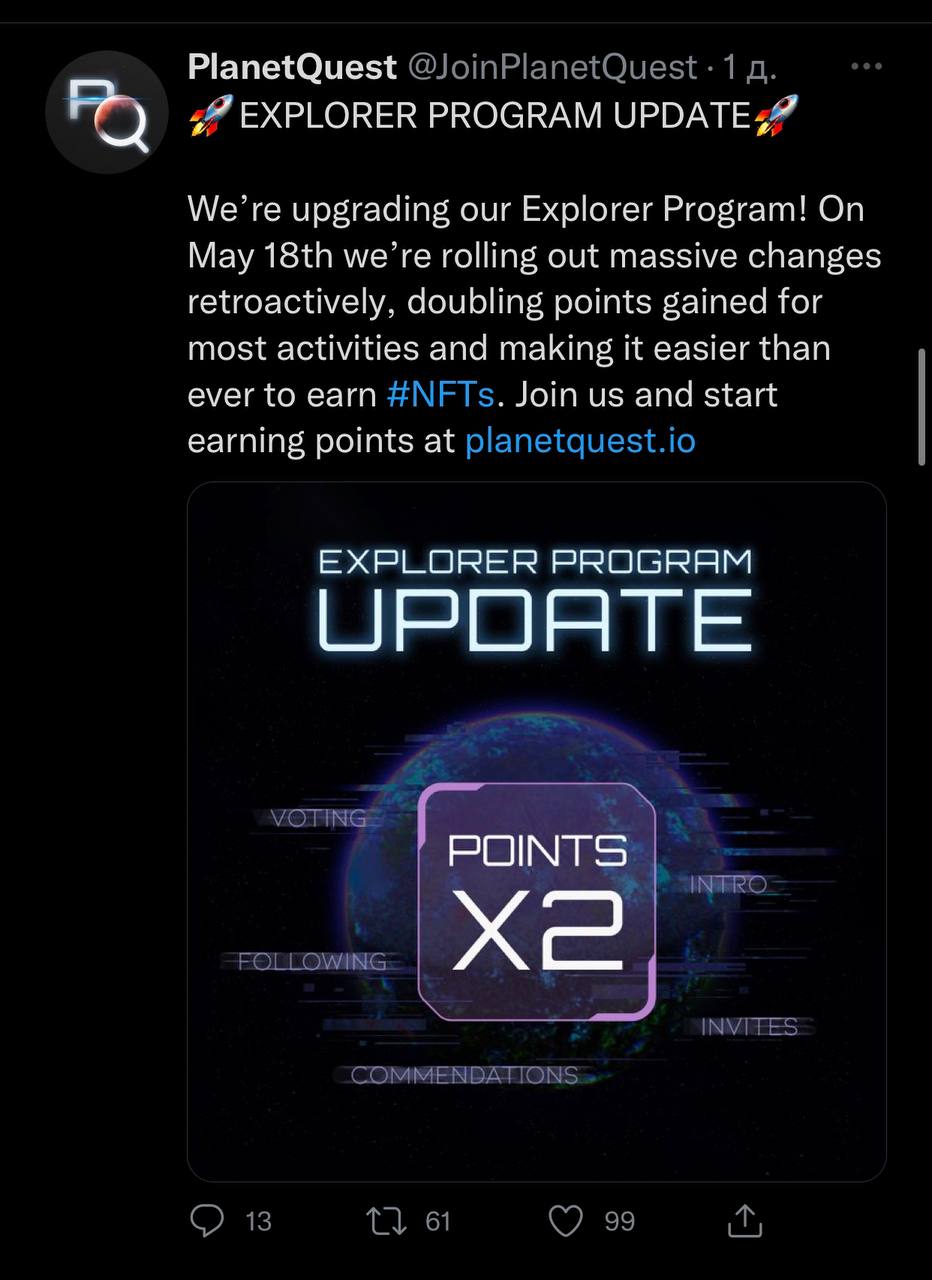 • За 1000 рефов (10000 поинтов) - NFT за 400$ + редкая планета (начальный прайс 2000$, но может дать x4)