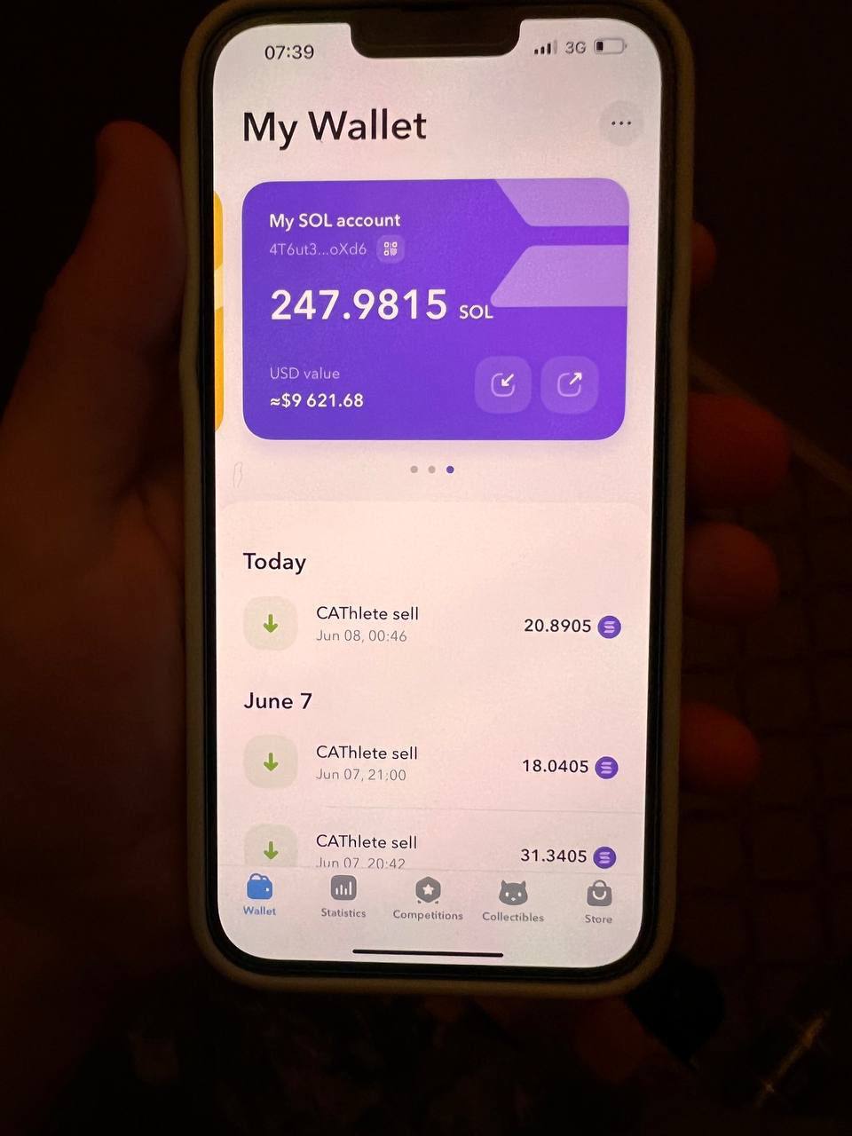 ▫️Кошель в игре на Солане. На маркете продаются всякие вещи для CatAthlete (одевая шмотку, мы повышаем стату персонажа) и сами CatAthlete за солану. Самый дешевый CatAthlete 6го левела ещё пару дней назад был 20 Sol. Сейчас маркет не работает! Как и игра кстати, сегодня лежит…