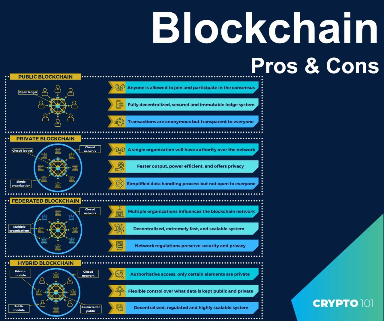 همانطور که قبلاً گفتیم، انواع مختلفی از بلاک چین وجود دارد و هر یک از آنها کاملاً متفاوت از دیگری است. در درس امروز به مزایا و معایب آنها خواهیم پرداخت.