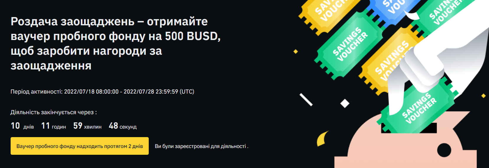 💬 Суть акції: нам дають ваучер на 500$, ці тестові BUSD ми розміщуємо у Binance Savings, і усі відсотки, які отримаємо з цього депозиту зможемо потім вивести.