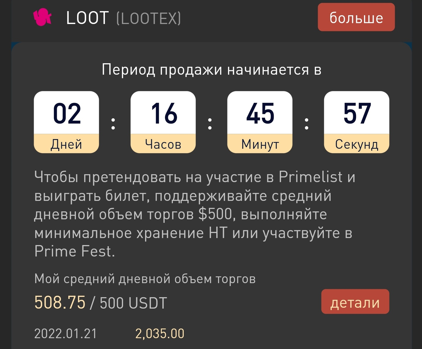 Также обязательно нужно держать 50 USDT на счету перед каждым праймлистом.