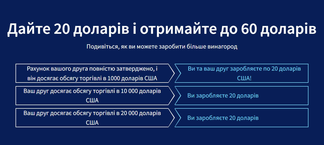 2. Додатковий бонус до 40$ для тих, хто запрошує (якщо друг робить збільшені обсяги торгів, ви отримуєте бонус).